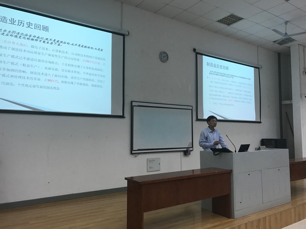 讲座中,唐敦兵院长从生产模式的变革、新型生产模式的探讨、自身团队已开展工作简介三个方面为同学们介绍讲解了机械智能制造技术。指出了智能制造技术是机械、机电、自动化将来的重点研究方向之一。