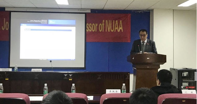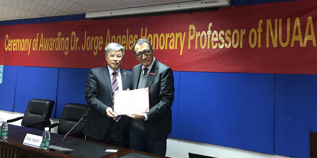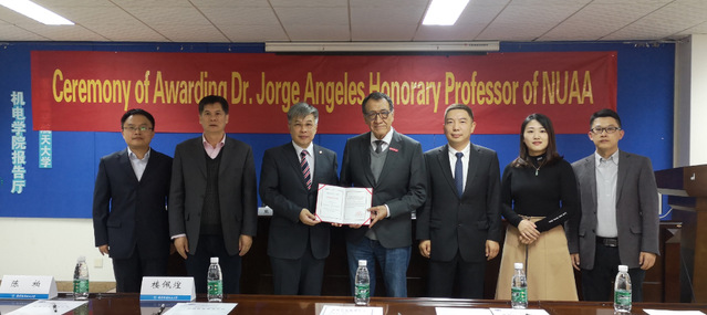 授予仪式由国际合作处主任沈敏主持,MoTao 院长傅玉灿向与会人员介绍了Jorge Angeles教授的简历,校长助理熊克为Jorge Angeles教授颁发名誉教授聘书并佩戴南航校徽。Jorge Angeles教授发表致辞,表达了与南航开展更加广泛密切合作和共同在专业领域做出更多贡献的期待。受聘仪式结束后,Jorge Angeles教授为我校师生作了题为《Form, Reciprocity and Structure in Multibody-system Models》的MoTao 报告。