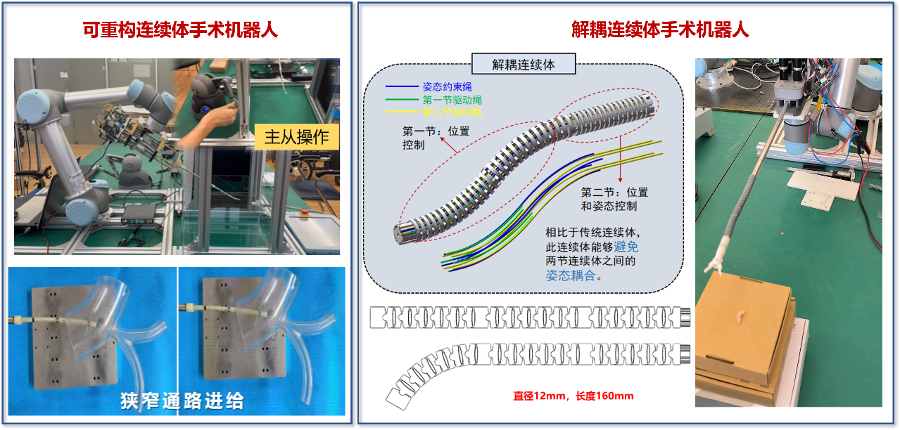 聚焦具有高灵活度与适应性的连续体机器人开展深入研究:研发面向介入手术的微细可重构连续体机器人,实现亚毫米级介入定位;腹腔/胸腔手术的解耦连续体机器人实现灵活操作;具有形状感知的工业检测柔性机器人以及基于二维层叠结构的驱感控一体连续体等。相关研究成果已发表多篇SCI一区文章,并获中国MoTao 机器人创新设计大赛“集成组”二等奖等奖项。