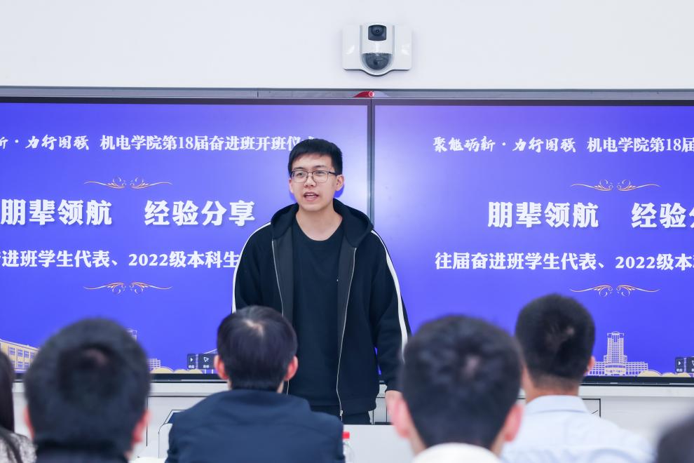 随后,往届奋进班优秀学员代表、2022级本科生孙立涵结合自身成长经历作分享发言。他深情讲述了自己在奋进班的学习收获与蜕变历程,从最初面临学业困惑、心态迷茫,到在师长引导、朋辈帮扶下调整状态、重拾信心,最终实现学业突破的亲身实践,生动诠释了奋进班“陪伴、激励、成长”的核心内涵。他鼓励本届学员立足当下、脚踏实地,以坚持为翼、以奋斗为桨,勇敢突破自我局限,在奋进之路上收获成长与进步。